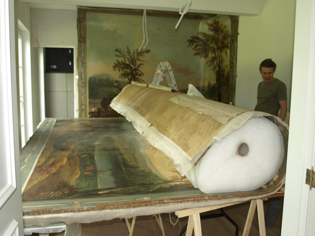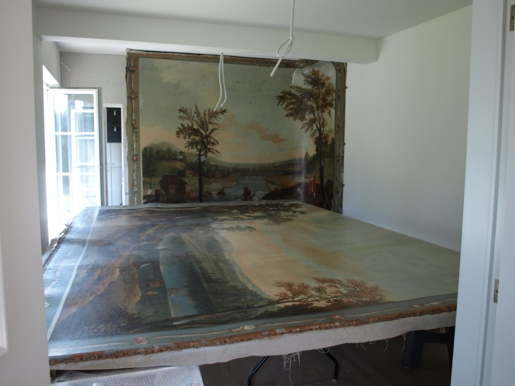 Les œuvres sont ôtées de leur emplacement dans l’ancienne maison et stockées dans l’atelier Artbee pour quelques traitements avant pose sur place. En effet, les 2 grands formats qui mesurent 3m75 de long ont été déposés de leur châssis pour entreposage sur un « train » construit par Mr Broers. Ce train en bois permet l’entreposage momentané de toiles grands formats tout en préservant la toile de toutes altérations.