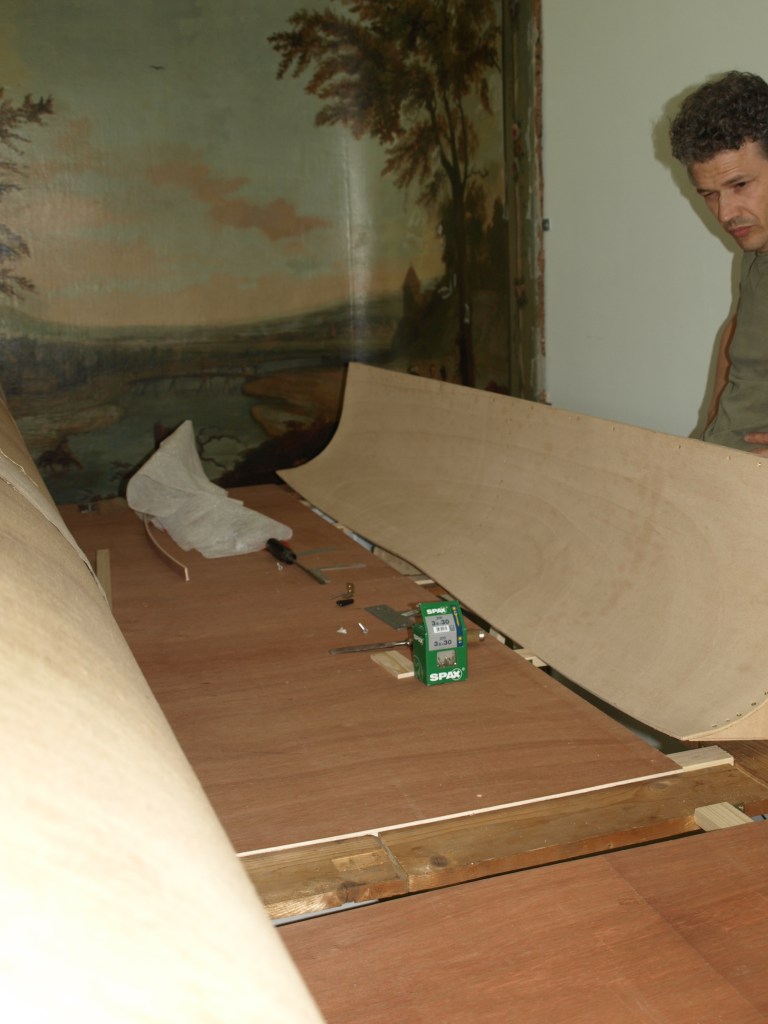 Suite à ce mail, je décide de parler de ce cas à un collègue restaurateur qui à l’habitude des grands formats. Suite à une réflexion commune nous décidons de proposer l’idée suivante aux propriétaires des toiles: réduire les œuvres de hauteur en courbant le dessus de la toile vers l’intérieur. Toutes les toiles possèdent une frise décorative peinte sur leurs pourtours et les dessus des toiles représentent tous des cieux. Le fait de les courber vers l’intérieur avec un rayon définit, commun à l’ensemble des tableaux, n’altérerait donc en aucun cas l’image.